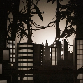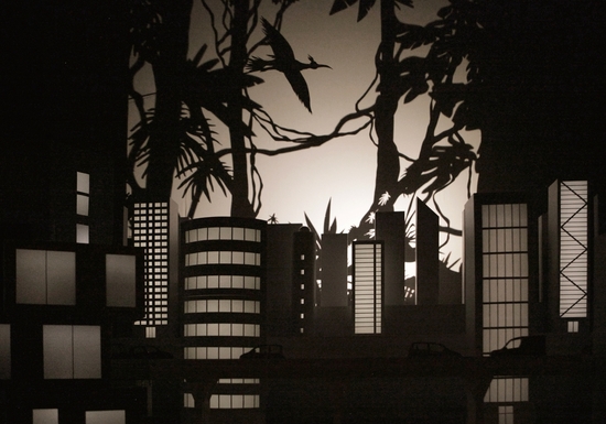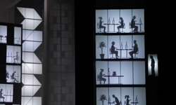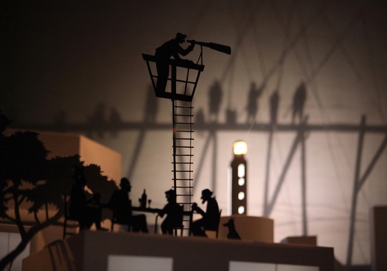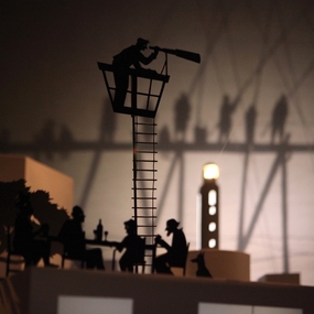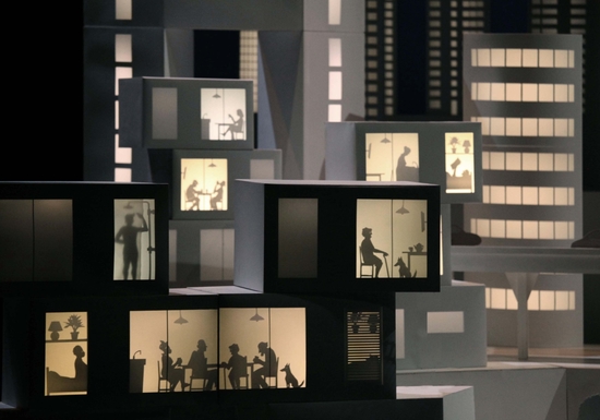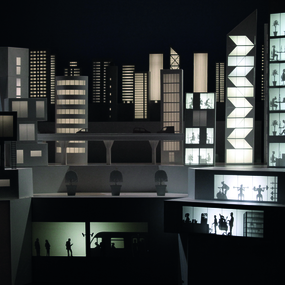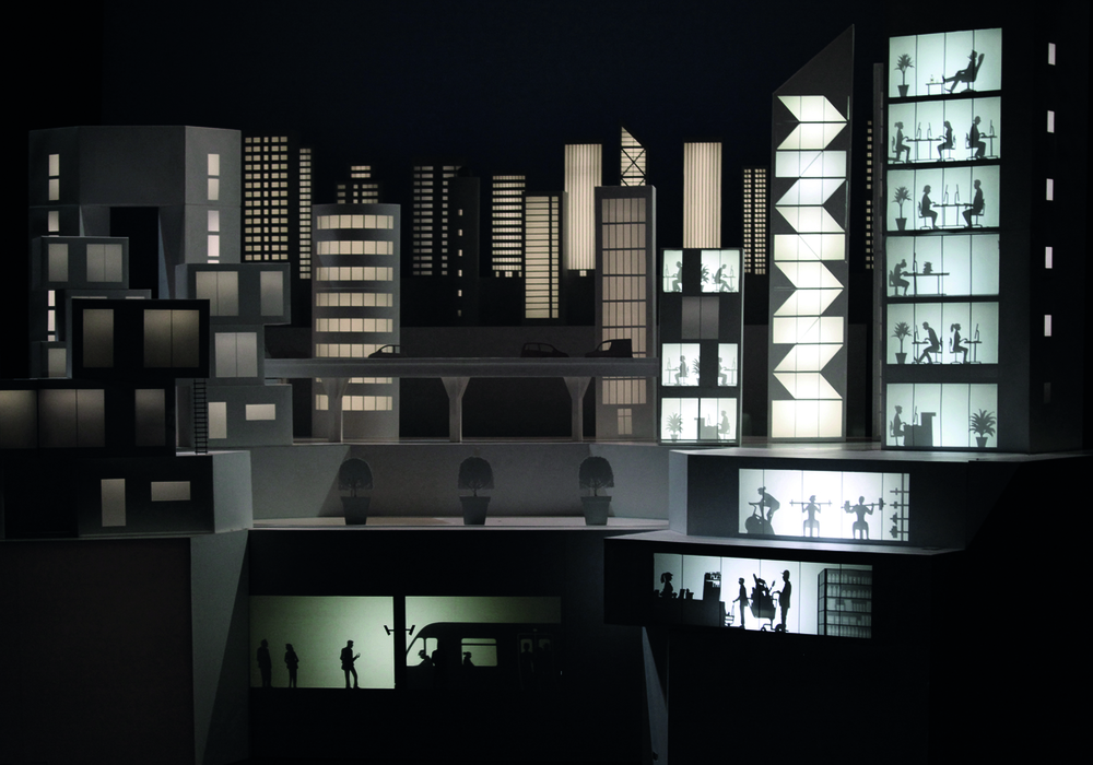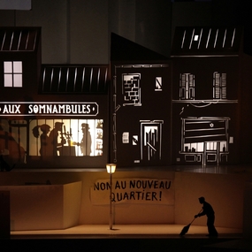 Issus du dessin, de la construction, de la scénographie, de la photographie et de la musique, les membres de la compagnie Les ombres portées cultivent leur originalité. Dans cette installation novatrice en volumes sur plusieurs niveaux, ils sont dissimulés mais aussi parfois exposés, manipulant les immeubles et autres constructions lors de la grande transformation du quartier en ville désincarnée.